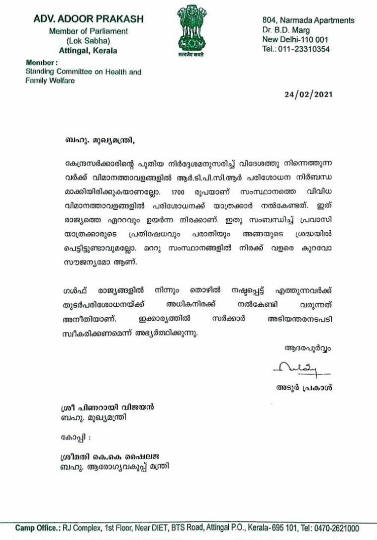 , ഇന്ത്യയിലെ മറ്റ് ഭൂരിഭാഗം എയർപോർട്ടുകളിലും RT-PCR ടെസ്റ്റിന് 500 മുതൽ 900 രൂപ വരെ ഈടാക്കുമ്പോൾ കേരളത്തിലെ എയർപോർട്ടുകളിൽ RT-PCR ടെസ്റ്റിന് 1700രൂപ വാങ്ങുകയും ടെസ്റ്റ് നടത്തുന്നത് സ്വകാര്യ സ്ഥാപനങ്ങൾ എന്നും അടൂർ പ്രകാശ് എം പി ആരോപിക്കുന്നു .