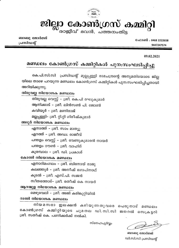 പത്തനംതിട്ടയിൽ 5- നിയോജകമണ്ഡലം കോൺഗ്രസ് കമ്മറ്റികൾ പുനർസംഘടിപ്പിച്ചതായി ഡി സി സി പ്രസിഡന്റ് അറിയിച്ചു