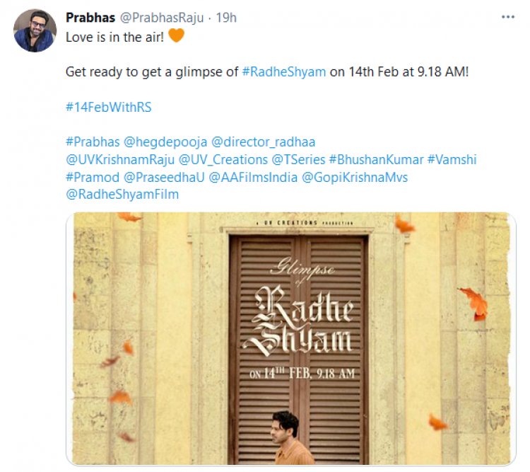 പ്രണയദിനത്തിൽ പ്രഭാസിൻ്റ റൊമാൻ്റിക് ചിത്രം രാധേശ്യാമിന്റെ ടീസര് പുറത്തിറങ്ങും. പ്രഭാസ് തന്നെയാണ് ഔദ്യോഗികമായി ഇക്കാര്യം അറിയിച്ചിരിക്കുന്നത്. ചിത്രത്തിലെ തന്റെ റൊമാന്റിക്ക് പരിവേഷത്തെ ആസ്പദമാക്കി തയ്യാറാക്കിയിരിക്കുന്ന പോസ്റ്റര് പങ്കുവെച്ചാണ് താരം ടീസര് പതിനാലാം തിയ്യതി പുറത്തിറങ്ങുമെന്ന വിവരം പുറത്തുവിട്ടത്.